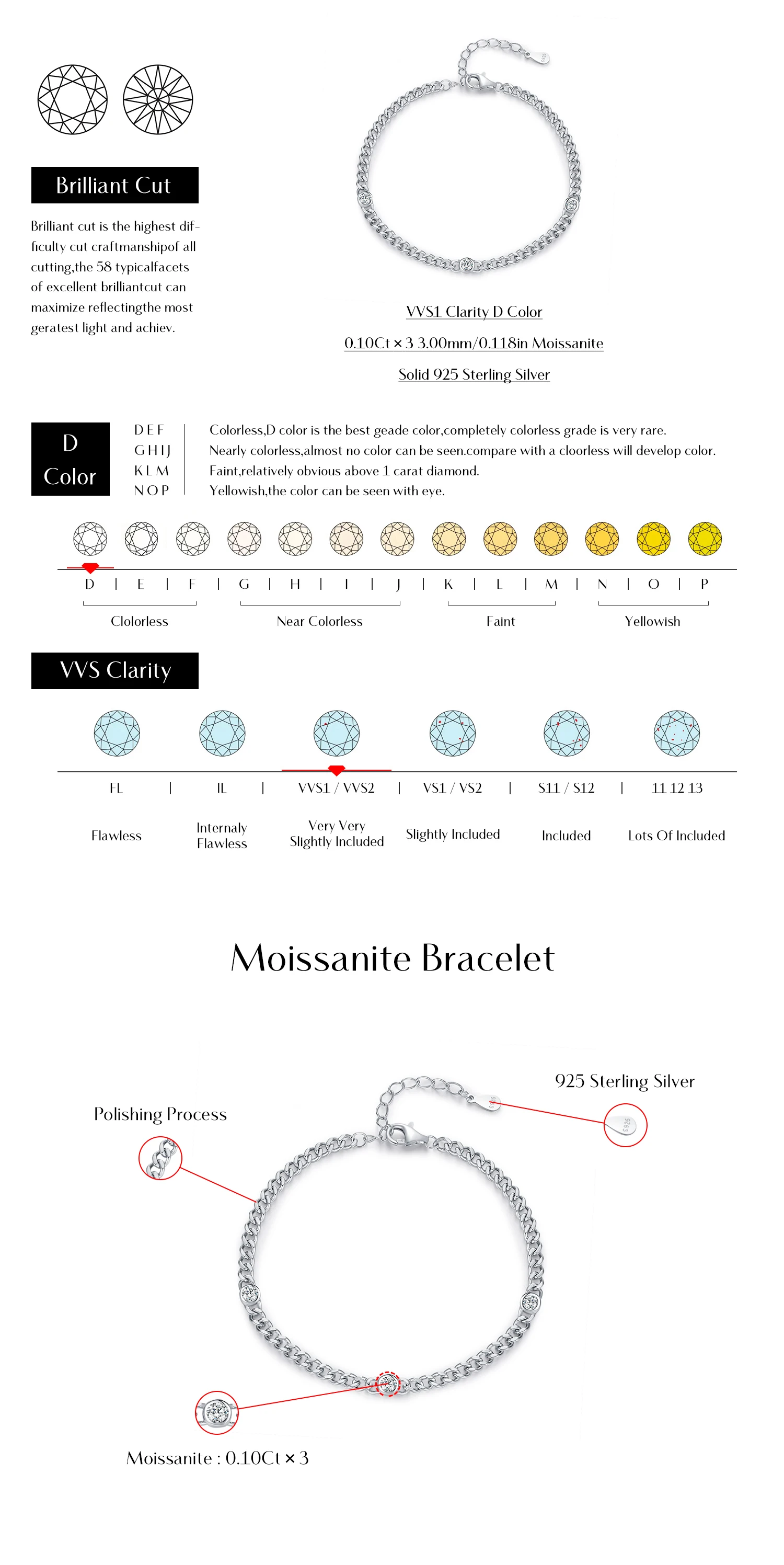 Bracelets Main Stone Weight/Pairs:Moissanite Diamond 0.1 Carat x 3